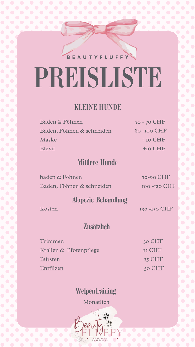 - Die angegebenen Preise sind Richtpreise und hängen vom aktuellen Zustand des Fells sowie dem Verhalten des Hundes ab. Daher kann der Preis von Besuch zu Besuch variieren.